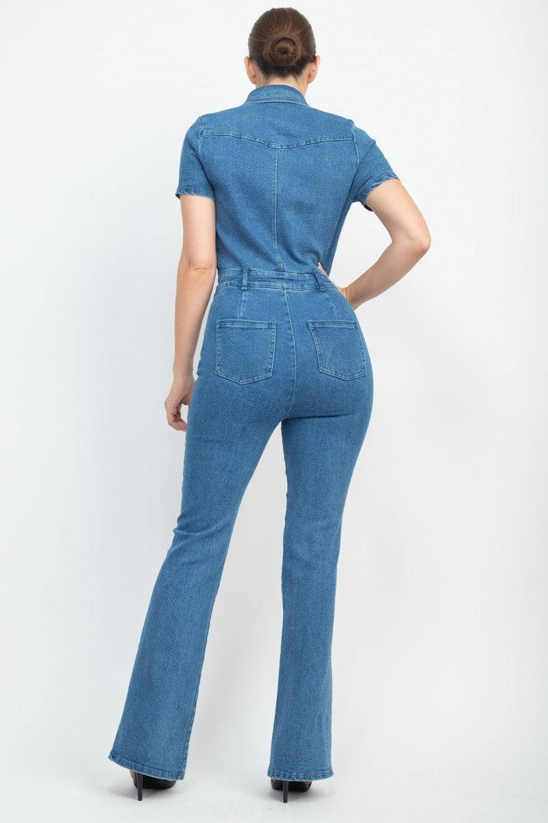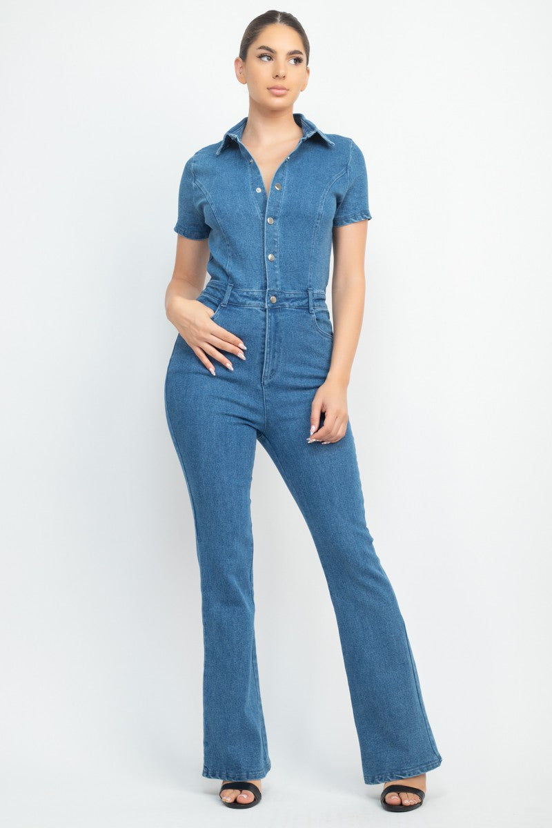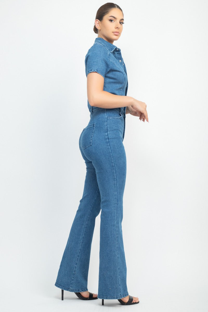 Short sleeve button front detail four-pocket detail jumpsuit with full-length flare hem