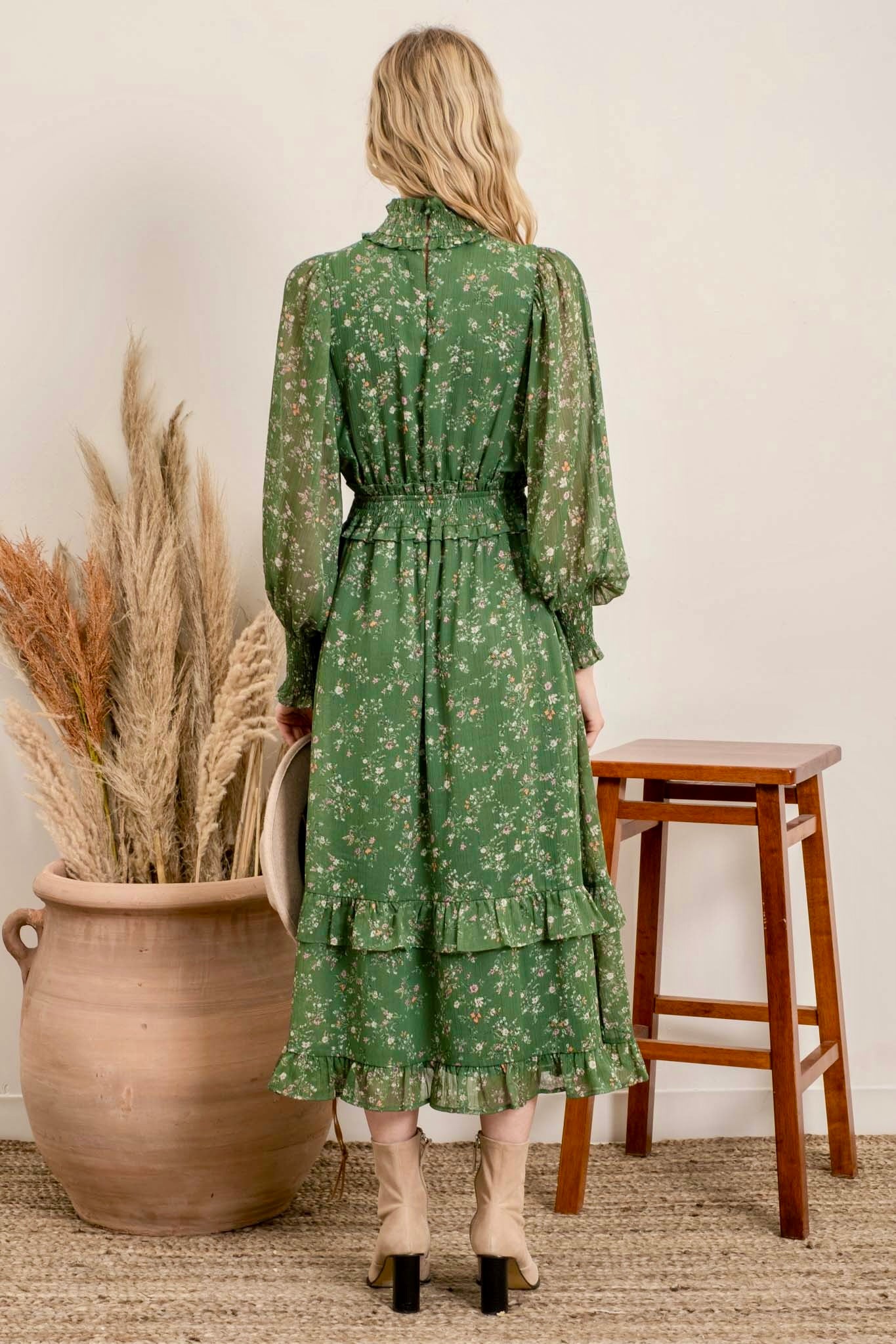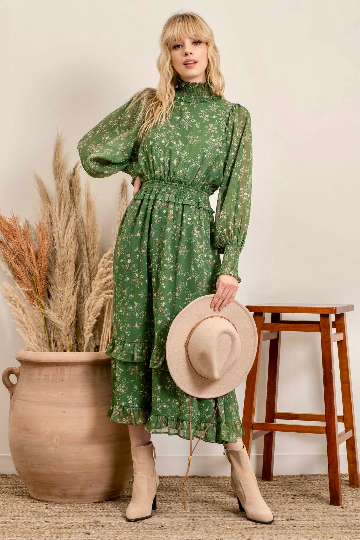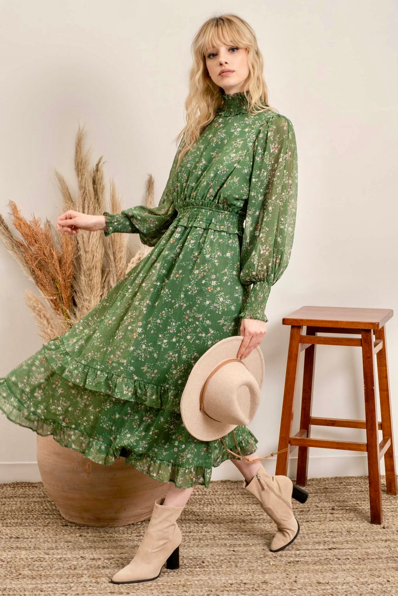 Maxi floral cinch waist mock neck long sleeve floral dress