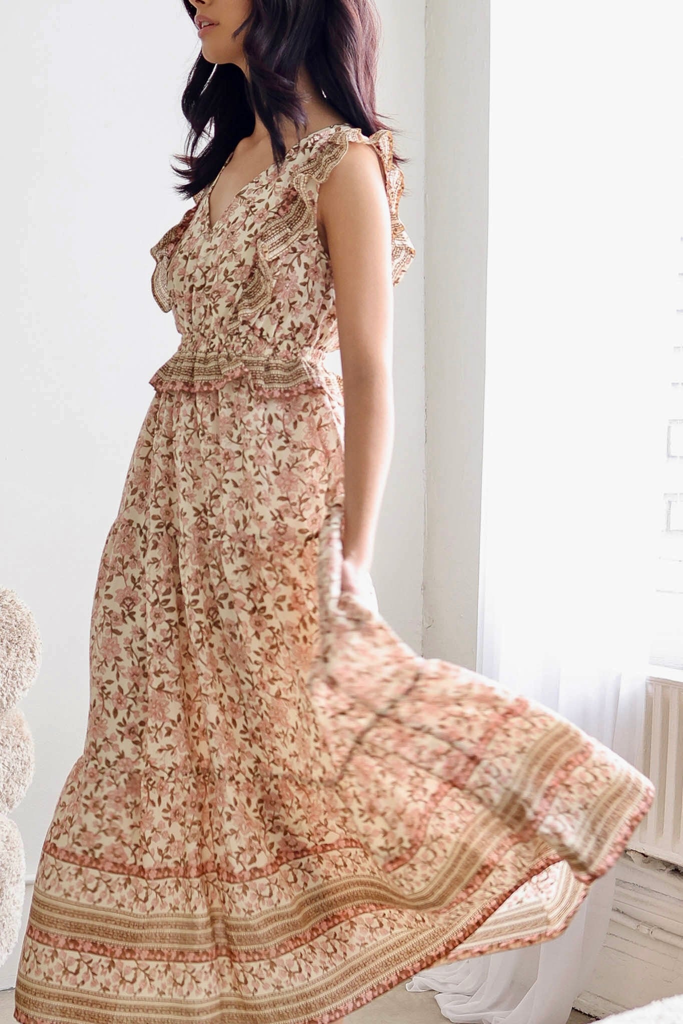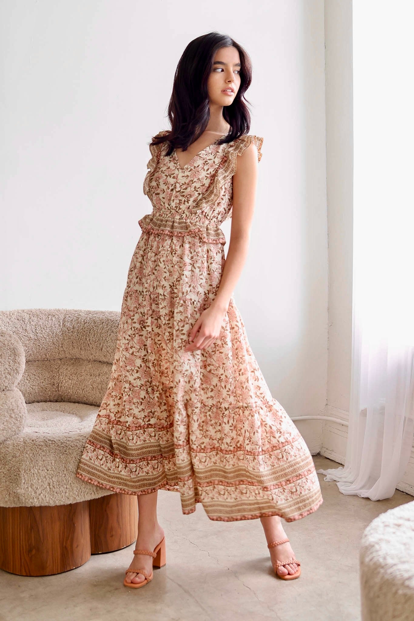 Ruffle detail cinched waist floral midi dress.