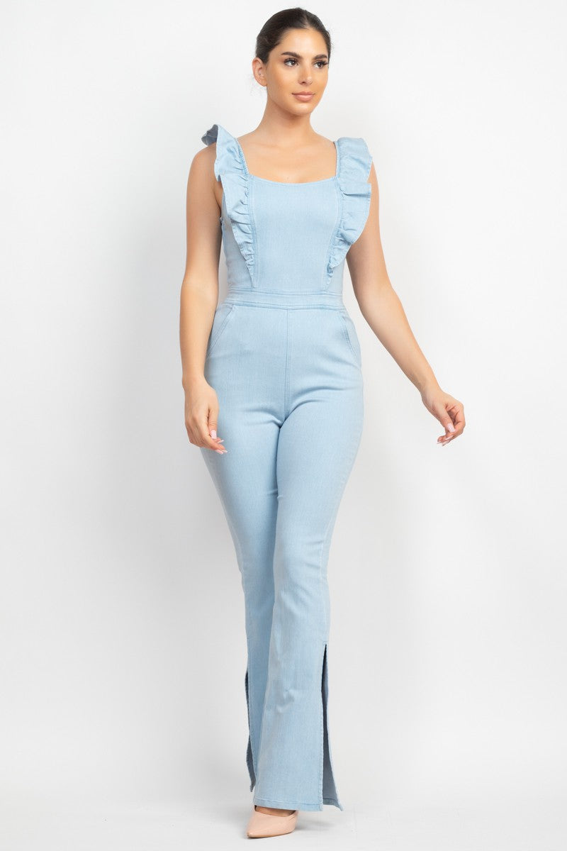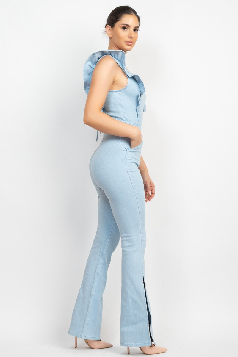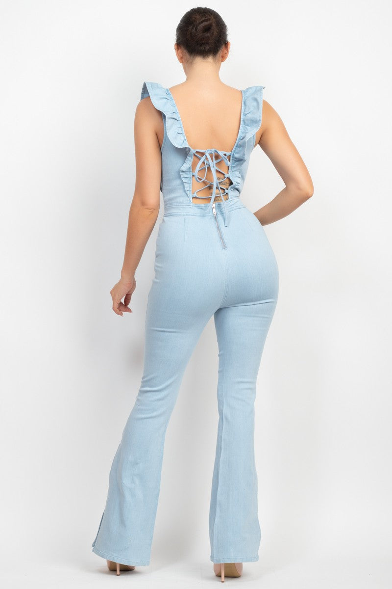Denim jumpsuit with square-neck front ruffle detail and crisscross back tie featuring a bell-bottom split hem